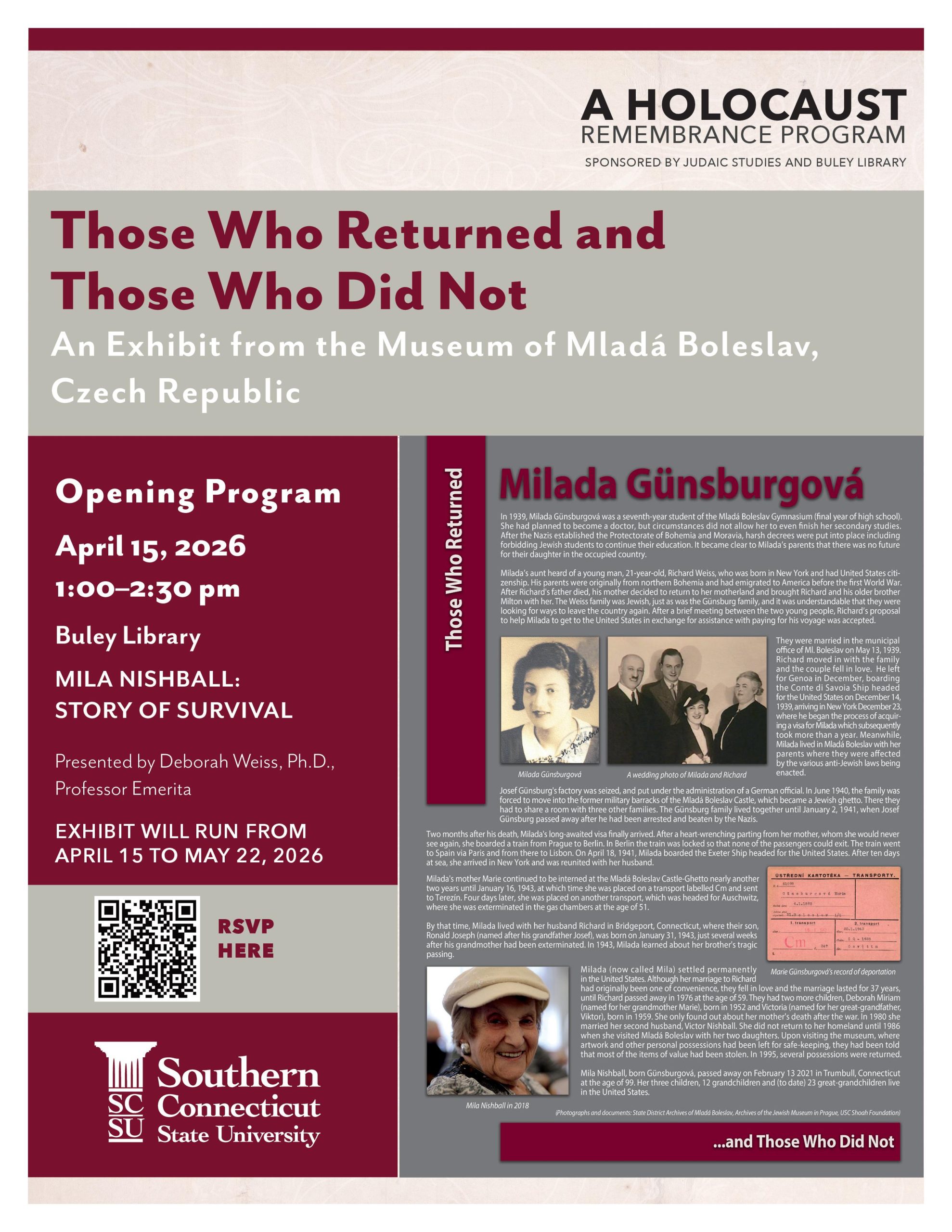 Join us for the opening program: “Mila Nishball: Story of Survival,” presented by Deborah Weiss, SCSU Professor Emerita, April 15, 2026, 1:00 -2:30 pm